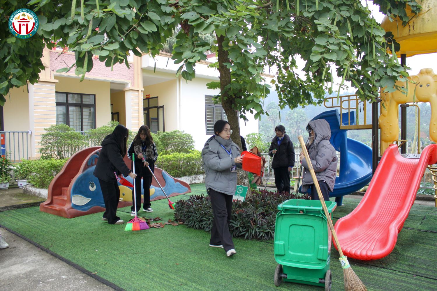 Các tình nguyện viên triển khai dọn dẹp và chỉnh trang cảnh quan môi trường tại điểm trường Mầm non xã Khả Cửu.