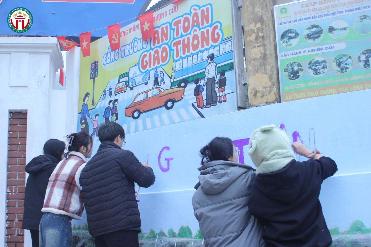 Các tình nguyện viên triển khai sơn tường và vẽ tranh trang trí, khoác áo mới cho điểm trường Mầm non xã Khả Cửu.