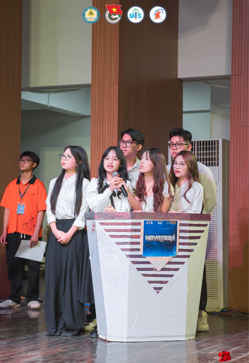 Tiếp đó, không khí tại hội trường càng trở nên sôi động khi bốn đội thi xuất sắc bước ra sân khấu - đại diện cho bốn màu sắc, bốn cá tính công nghệ đầy năng lượng. The Conquerors, mở màn cho đêm chung kết, dưới sự dẫn dắt của hai mentor Th.S Hoàng Hải Xanh và Th.S Phạm Thị Xuân Lộc, mang đến một màn chào sân đầy sức sống, khiến khán phòng như bùng nổ ngay từ những giây phút đầu tiên. Tiếp nối, Novatech cùng Th.S Hoàng Thị Thanh Liễu và CEO Trần Trung Kiên, khẳng định tinh thần đổi mới và sáng tạo, thu hút mọi ánh nhìn với màn giới thiệu tự tin, rực lửa. Không kém phần ấn tượng, Cybergals - đội thi nữ đầy tài năng - cùng Th.S Hoàng Vân Anh và Anh Nguyễn Quang Ngọc, mang đến sắc màu riêng biệt với sự kết hợp giữa năng lượng nữ giới và tri thức công nghệ, tạo nên những khoảnh khắc đáng nhớ. Cuối cùng, MMP dưới sự đồng hành của Th.S Trần Thị Hương và TS. Lê Thiện Hòa, xuất hiện giữa tiếng hô vang cổ vũ của khán giả, thể hiện quyết tâm, bản lĩnh và khí thế bứt phá, hoàn thiện bức tranh đầy màu sắc của bốn đội thi trong đêm Chung kết.
