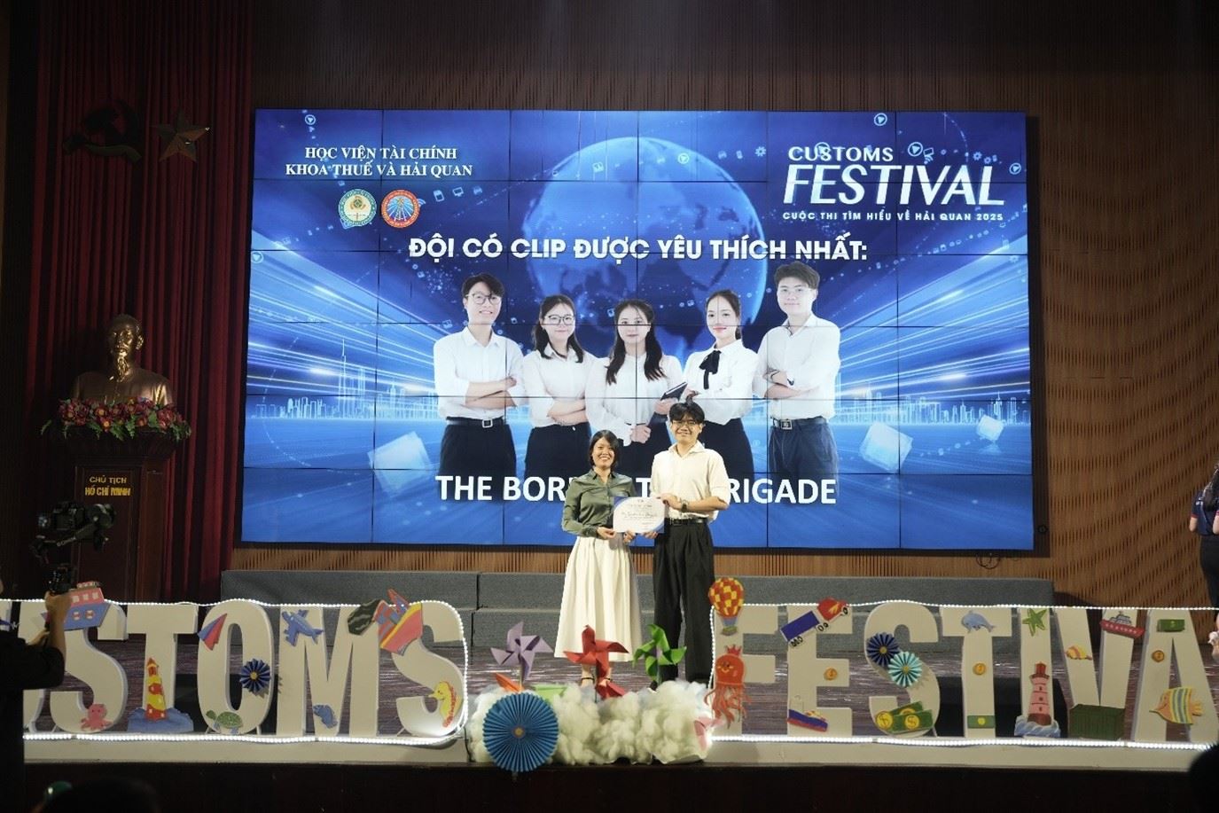 PGS.TS Lê Xuân Trường và TS Nguyễn Đình Chiến tặng hoa và trao giải cho đội thi giành giải nhất Festival Hải quan 2025.
