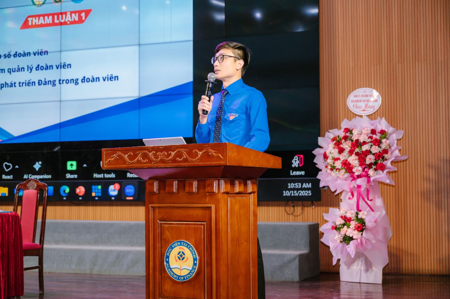 Tại phần nội dung báo cáo tham luận, đ/c Tạ Đình Hoà - Bí thư Đoàn thanh niên Học viện đã trình bày tham luận thứ nhất với chủ đề "Cơ cấu tổ chức Đoàn - Hội và tiện ích Cổng sự kiện". trong bài tham luận, đồng chí nhấn mạnh tầm quan trọng của việc kiện toàn cơ cấu tổ chức đoàn - hội nhằm nâng cao hiệu quả hoạt động, đồng thời giới thiệu và phân tích những tiện ích nổi bật của cổng sự kiện học viện tài chính - nền tảng hỗ trợ quản lý, điều phối và kết nối thông tin trong các hoạt động đoàn - hội, góp phần thúc đẩy quá trình chuyển đổi số trong công tác đoàn thanh niên.