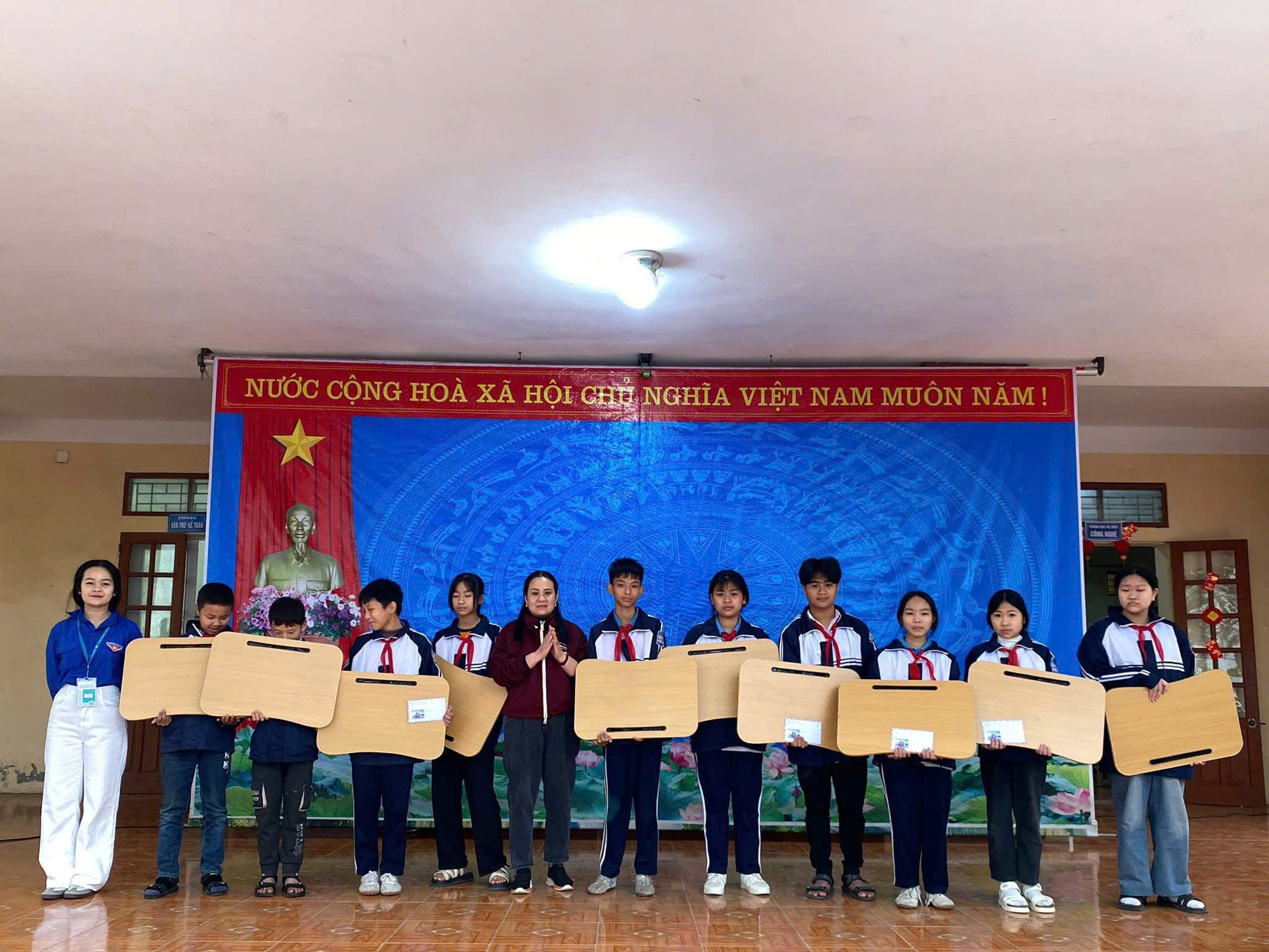 trao tặng 150 đệm đơn giường tầng, 150 chăn ấm cho học sinh ăn ở bán trú tại trường, 456 áo rét cho các em học sinh tại điểm trường PTDTBT TH và THCS xã Xuân Lập, Huyện Yên Bình, Tỉnh Tuyên Quang