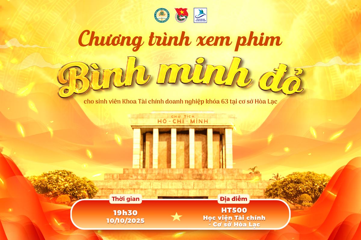 Hướng tới kỷ niệm 71 năm Ngày Giải phóng Thủ đô (10/10/1954 – 10/10/2025), Liên Chi đoàn Khoa Tài chính Doanh nghiệp tổ chức chương trình xem phim “Bình minh đỏ” dành cho sinh viên Khóa 63 đang học tập tại cơ sở Hòa Lạc. Đây là hoạt động nằm trong chuỗi chương trình thực hiện Công tác Đoàn - Hội và phong trào thanh niên năm học 2025–2026, hướng đến giáo dục truyền thống lịch sử, khơi dậy lòng yêu nước, niềm tự hào dân tộc trong thế hệ trẻ hôm nay.