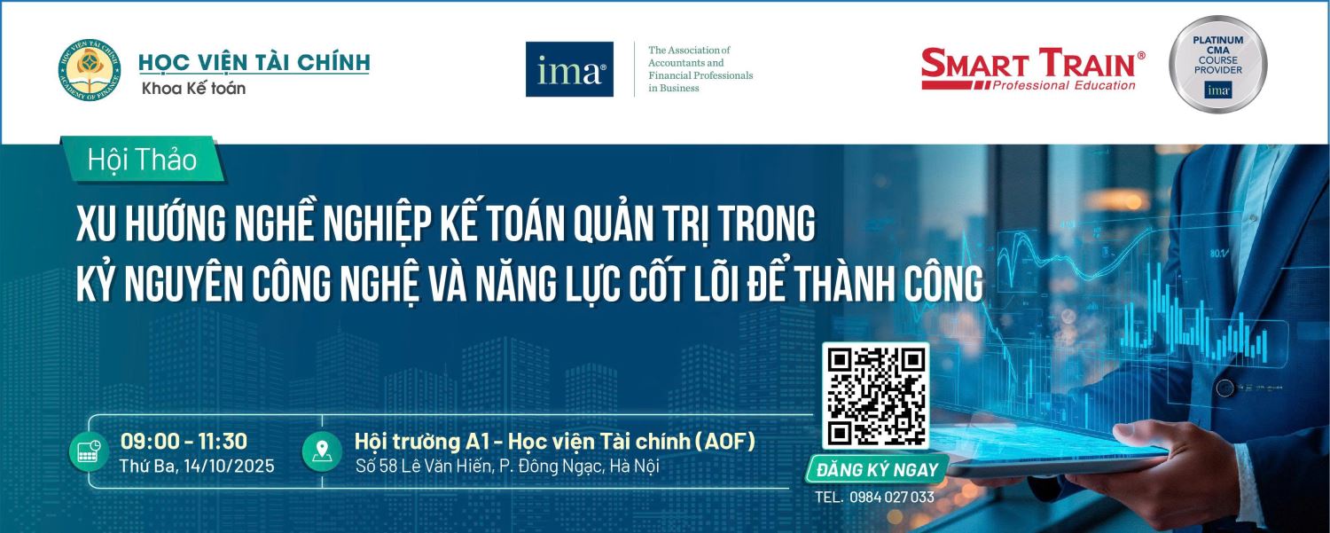 Nhằm giúp sinh viên hiểu rõ hơn về xu hướng nghề nghiệp đầy tiềm năng này, Khoa Kế toán – Học viện Tài chính đã phối hợp cùng Smart Train Academy và Hiệp hội Kế toán Quản trị Hoa Kỳ (IMA) để tổ chức buổi hội thảo chuyên đề với chủ đề: “Xu hướng nghề nghiệp Kế toán quản trị trong kỷ nguyên công nghệ và năng lực cốt lõi để thành công”