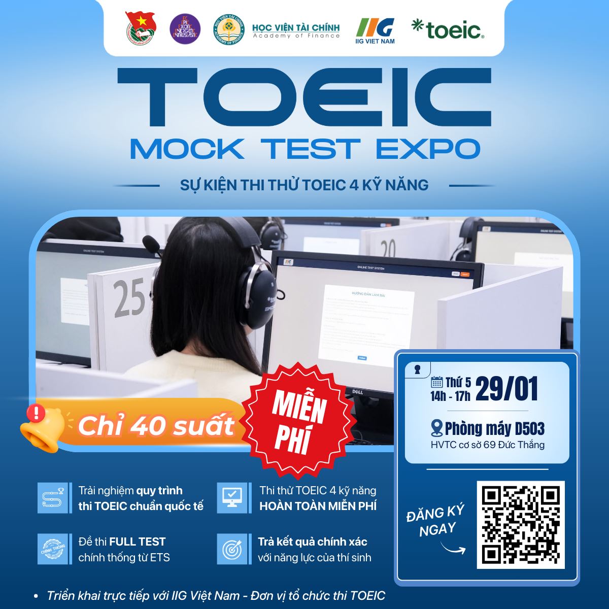 [IIG x EC_AOF] CLB Tiếng Anh mở đơn đăng ký trải nghiệm bài thi TOEIC thực tế đúng chuẩn ETS HOÀN TOÀN MIỄN PHÍ lần đầu tiên tổ chức tại Học viện Tài chính bởi Đơn vị tổ chức thi IIG Việt Nam.