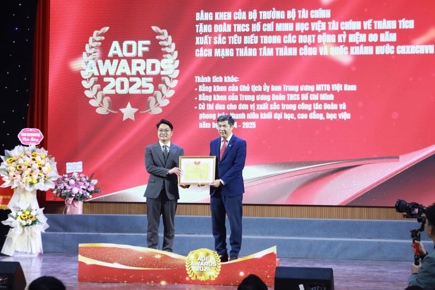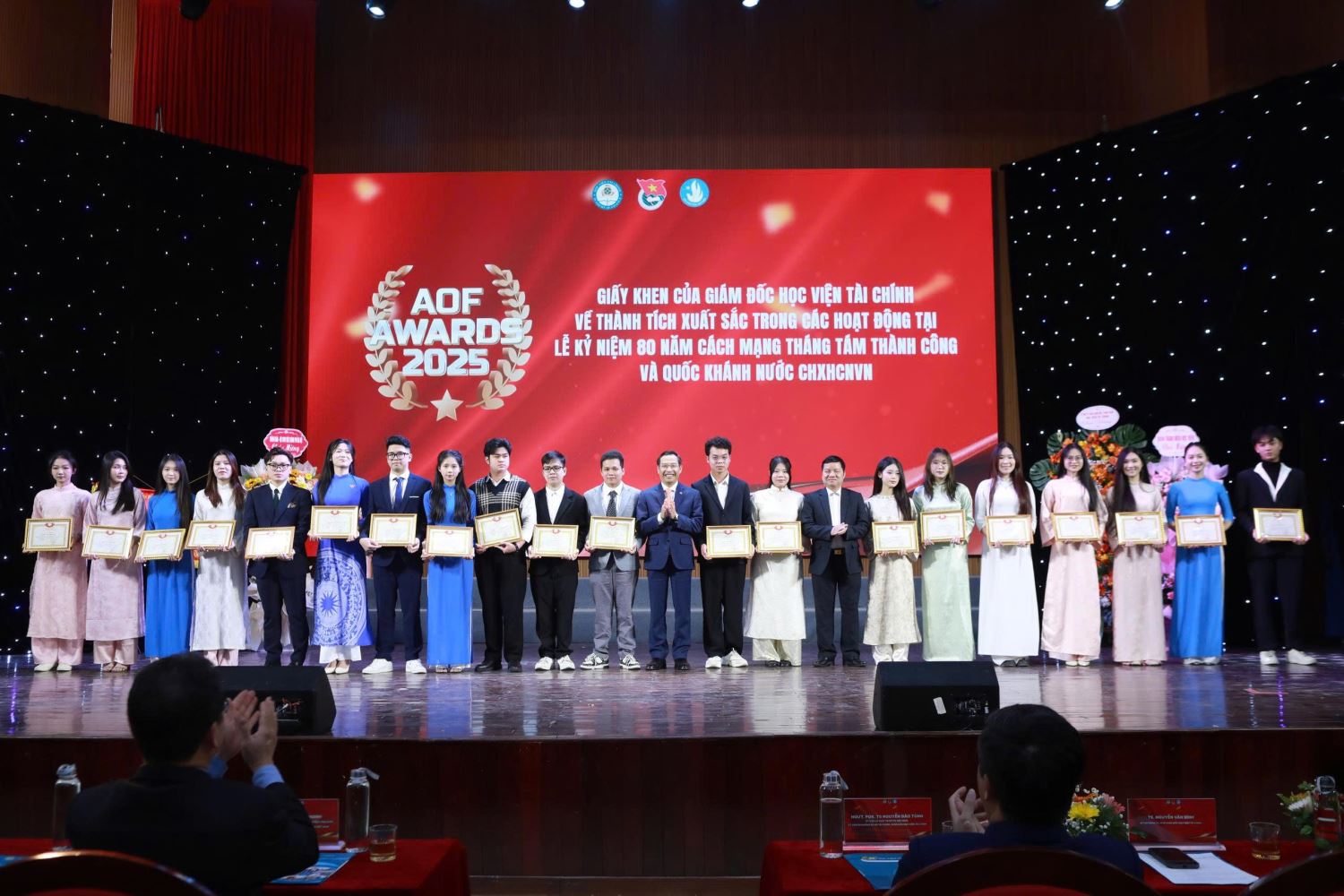 Sự kiện AOF AWARDS 2025 vinh danh và tuyên dương 1 Cờ thi đua xuất sắc của Trung ương Hội, 1 Cờ thi đua xuất sắc của Thành đoàn Hà Nội, 23 Sinh viên 5 tốt cấp Trung ương và Thành phố, 1 Giải thưởng Sao Tháng Giêng, 10 Gương mặt sinh viên tiêu biểu Học viện Tài chính trên các lĩnh vực học tập, nghiên cứu khoa học, khởi nghiệp kinh doanh, tình nguyện, thể dục thể thao, văn hóa nghệ thuật, truyền thông và hội nhập, cùng gần 80 cá nhân và nhóm đề tài nghiên cứu khoa học sinh viên đạt giải cấp Bộ và các cuộc thi quy mô lớn, gần 50 tập thể và cá nhân có thành tích xuất sắc trong công tác Đoàn - Hội năm học qua.